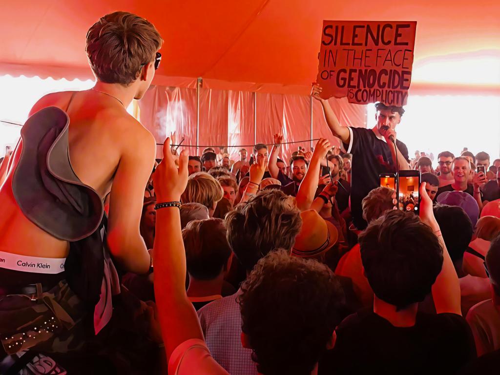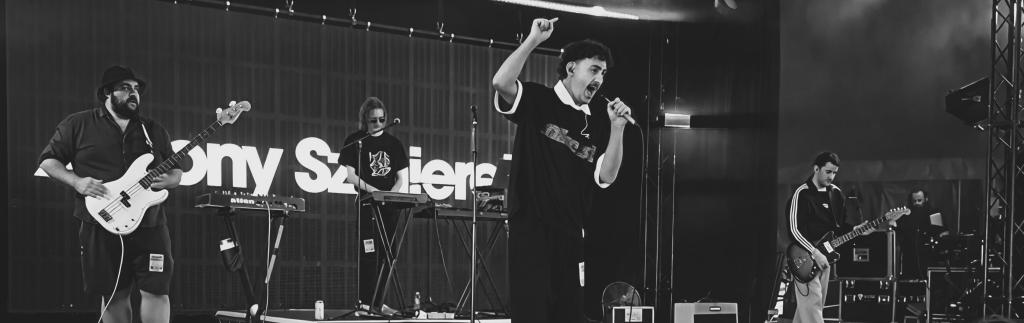 Sadly, we missed both ‘The Great Pyramid of Stockport’ and ‘Yoga Teacher’ as he front-loaded them in an effort to get the crowd going. What we did witness was the honesty and passion that he brings to his performances. Despite the short length of time to perform, he delivered impassioned speeches on Gaza and the state of the world. Jumping the barrier, he dived into the crowd and invited everyone to come and dance with him. The energy was spectacular, and the peace and love vibes were far higher than we would have anticipated.